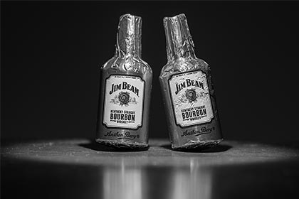 Or, more accurately, I came into Melanie’s studio this afternoon, where she’d produced four miniature bottles of Jim Beam. She bit off the top of the bottle, then poured the meager contents into a shot glass before eating the chocolate bottles.