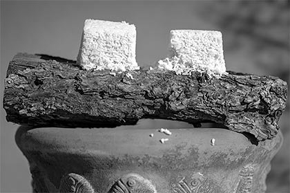 Polly brought over some Chinese takeaway and discovered that the restaurant had given her two containers of white rice she hadn’t ordered and wouldn’t eat. I didn’t want the bleached swamp grass either, but I also hate to waste alleged food. As a compromise, I photographed the rice blocks yesterday on my birthday and made Sixty-Seven Rice, then left the remains for a birds and rats feast.